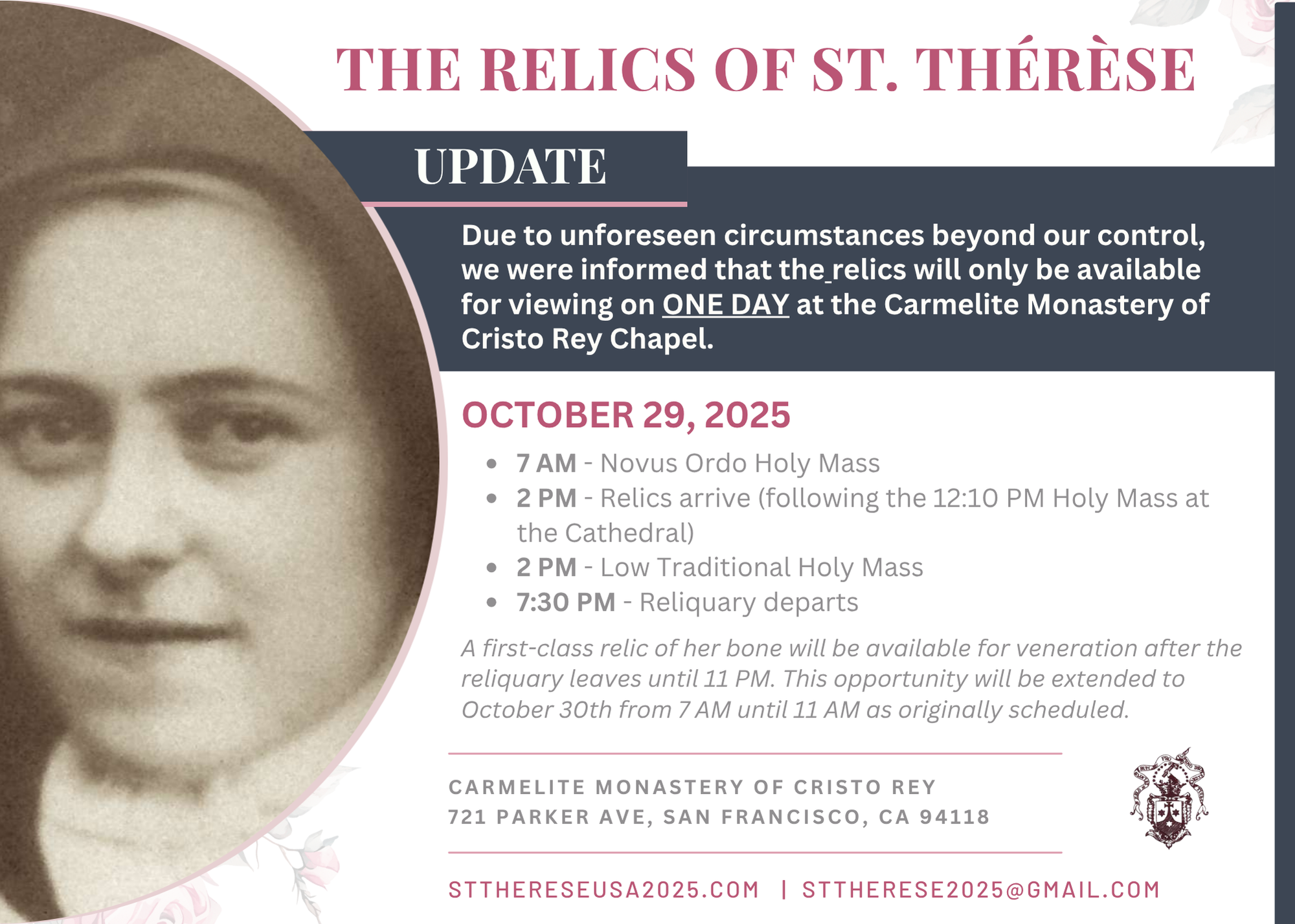 For those who are unable to adjust their schedules, we will have a first-class relic of her bone available for the faithful to venerate after the reliquary departs on October 29th until 11 PM. This opportunity will be extended to October 30th, where the relic will be available until 11 AM as originally scheduled.